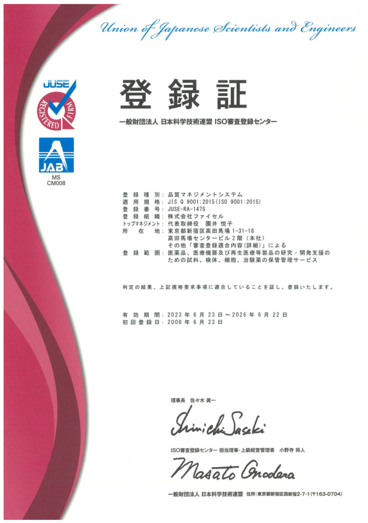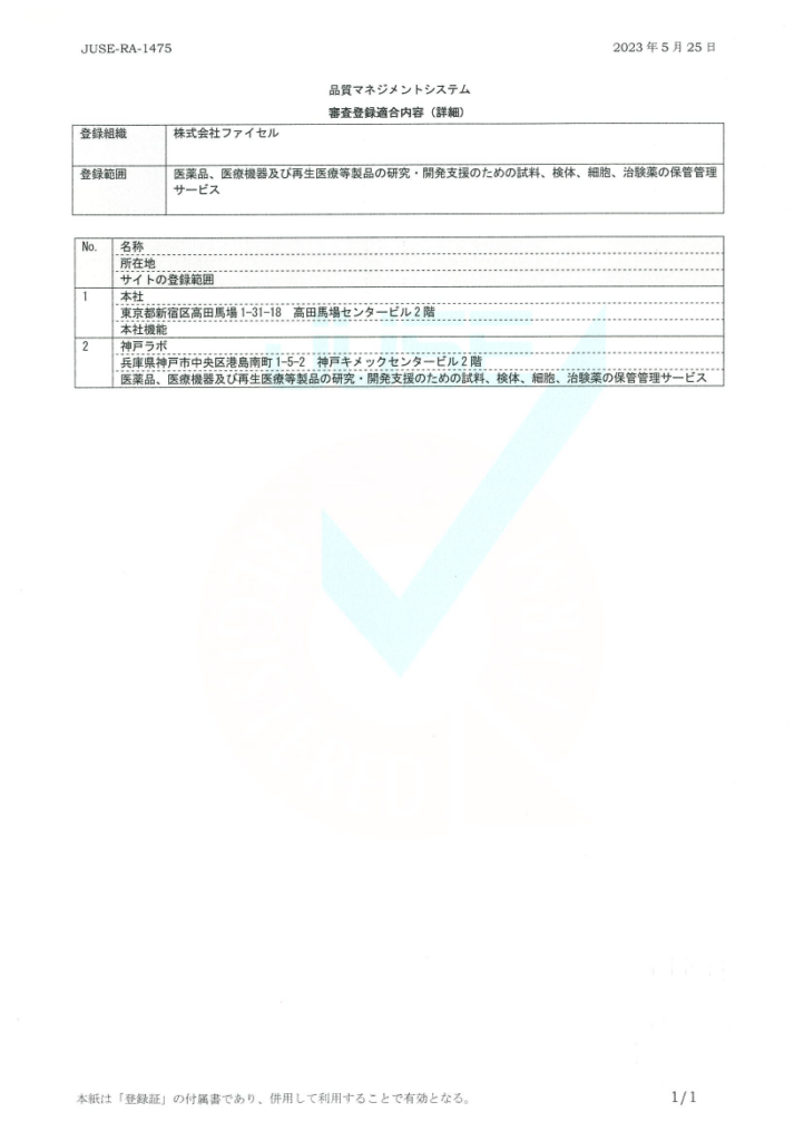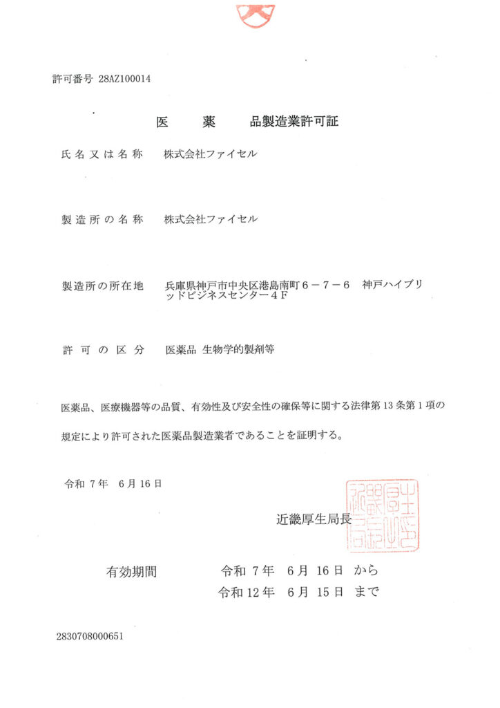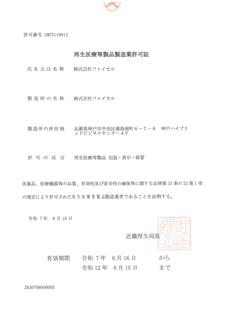 再生医療等製品製造業許可(許可番号:28FZ110012)、医薬品製造業許可(許可番号:28AZ100014)を取得